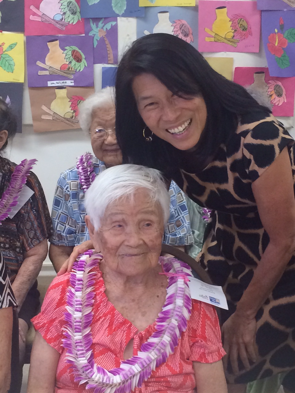 Aloha United Way kicked off a new initiative called Random Acts of Aloha, which mobilizes the caring power of our local community to demonstrate the impact of giving back and encourage individuals and businesses to participate in AUW’s annual campaign, which kicks off this August.  AUW received lei as a donation from local company Aloha Island Lei, which were distributed this afternoon by volunteers from AUW’s Society of Young Leaders to over 100 elderly individuals at Moiliili Community Center and Palolo Chinese Home as a surprise and as part of Random Acts of Aloha.At Moiliili Community Center, the surprise gifts of lei were especially timely as their oldest participant, named Shizuko, had just celebrated her 102nd birthday a few days prior. At Palolo Chinese Home, day care, nursing, and care home participants were thrilled and honored to receive the beautiful lei. Both senior groups welcomed the lei with hugs, cheers and in some cases, even happy tears.