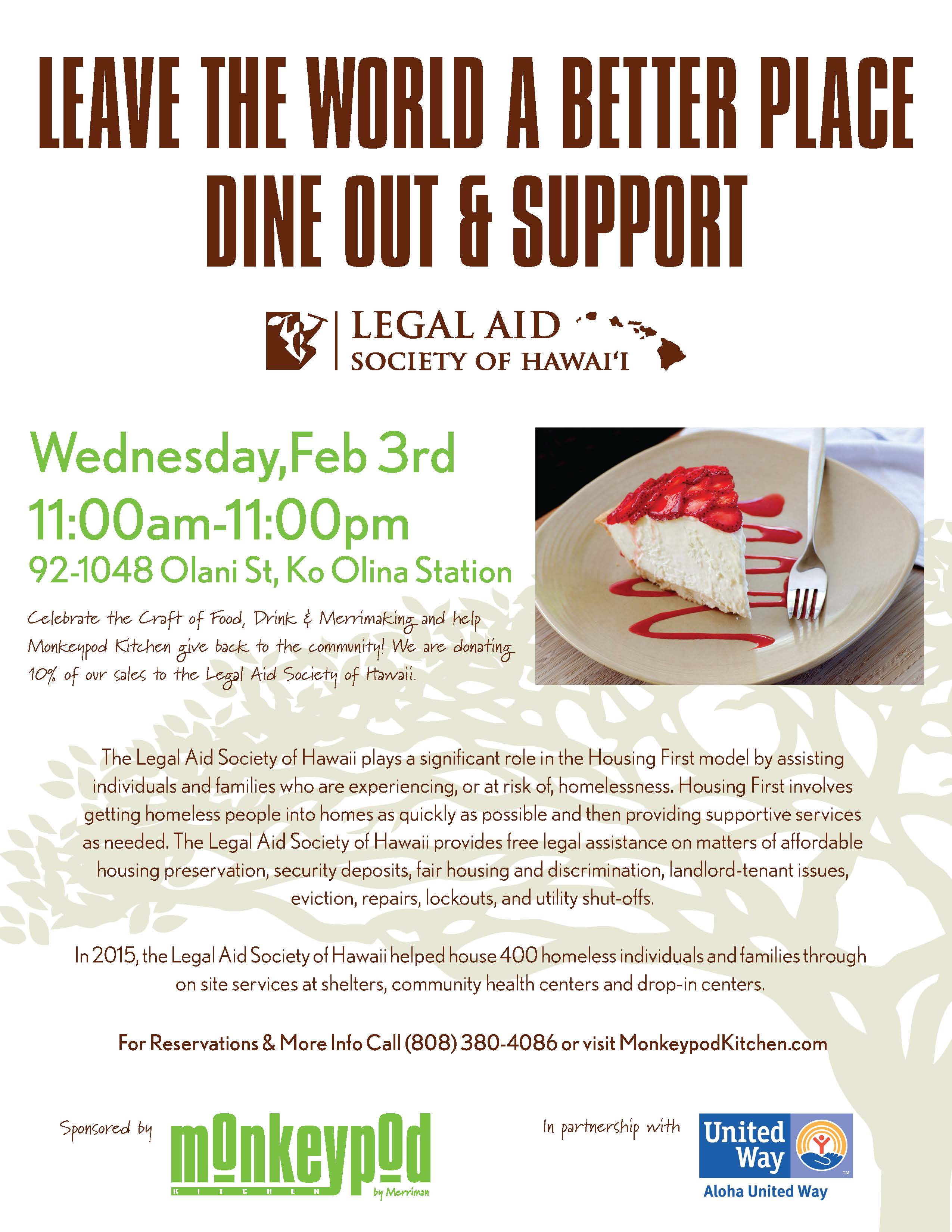 Dine at Monkeypod Kitchen on Wednesday, February 3 and Support Legal Aid Society of Hawaii